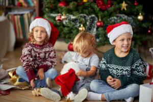 child boy in Santa hat at Christmas.Happy childhood on Christm